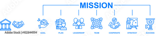 © Jefri, Obraz premium Mission banner web icon set vector illustration concept with icon of goal, plan, leadership, team, cooperate, strategy and success