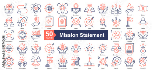 Fototapeta premium Mission Statement Icon Collection Set.Containing Mission, Purpose, Values, Vision, Core Focus, Commitment, Statement, Strategy icon. Simple dual tone style Vector Illustration.