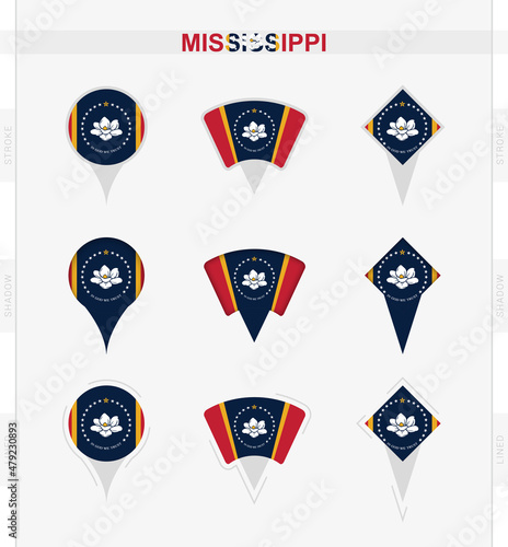 Naklejka premium Mississippi flag, set of location pin icons of Mississippi flag.