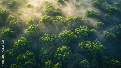 Fototapeta premium Mist-blanketed lush green canopy nature landscape serene environment aerial view tranquility concept