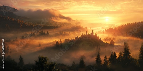 Fototapeta premium Mist blankets the valley as the sunrise illuminates the scene, creating a...