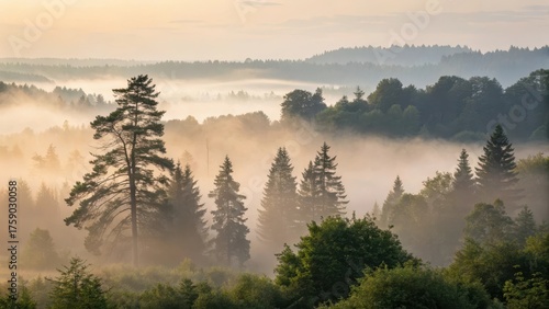 © Photo, Fototapeta premium Mist filled forest landscape in early morning sunlight