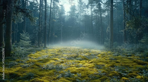 Obraz premium Mist forest concept. A tranquil forest scene with mist and vibrant moss...