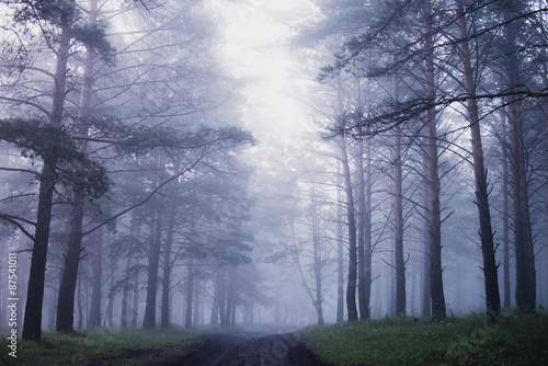 Fototapeta premium mist in coniferous forest, morning, after rain