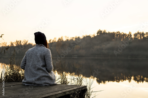 © svitlini, Naklejka premium mist over the lake. reeds and the girl sitting on a wooden jetty