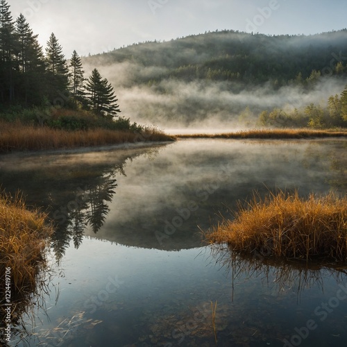 © Rafiq, Fototapeta premium Mist rising from a golden slope near a calm, reflective pond.