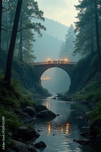 © Janmo, Fototapeta premium Mist-shrouded bridge spans serene forest stream with glowing yellow light, trees, foliage, arches
