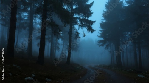 Fototapeta premium Mist-Shrouded Forest with Various Paths Illuminated by Atmospheric Lighting,...