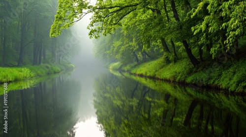 Obraz premium Mist-veiled river winds through lush green trees, reflecting a tranquil...