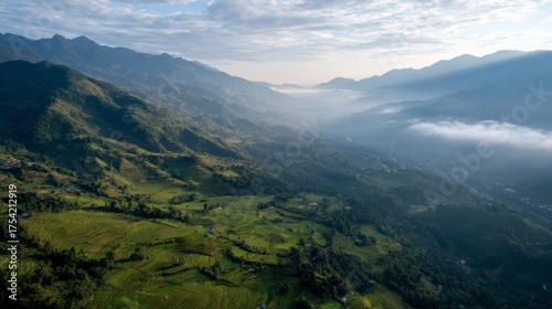 Fototapeta premium Mist-wreathed mountains cradle emerald valleys, whispering secrets of new...