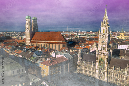 © Buffy1982, Fototapeta premium Misteriosa veduta aerea della città di Monaco con la nebbia al tramonto