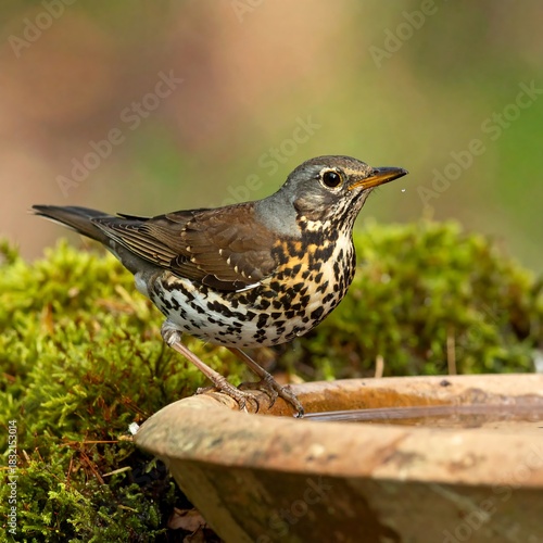 © bella, Fototapeta premium Mistle Thrush Perched on Bird Bath in Garden Setting.
