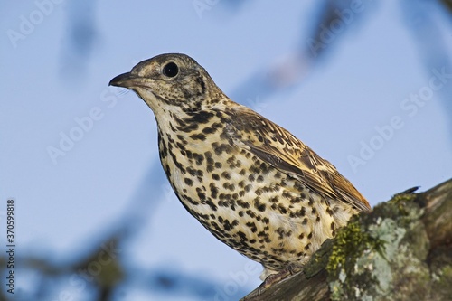 Fototapeta premium Mistle Thrush, turdus viscivorus, Adult standing on Branch, Normandy
