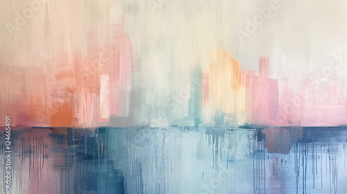 Naklejka premium Misty Abstract Reflections on the Water Painting with Impressionistic Brushstrokes and Pastel Cityscape Hues