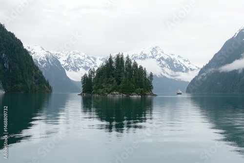 © syifa, Fototapeta premium Misty Alaskan fjord landscape with small island