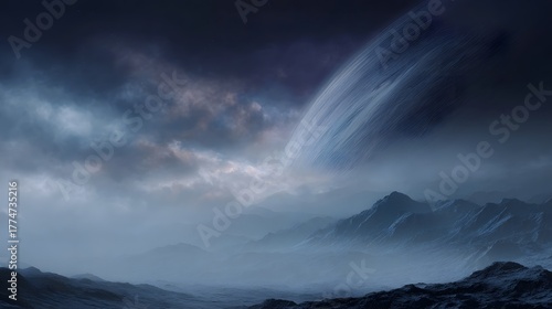 Naklejka premium Misty alien landscape with a massive planet looming in a dramatic cloudy sky