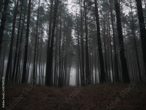 Obraz premium Misty and dark pine woods . Autumn gloomy landscape