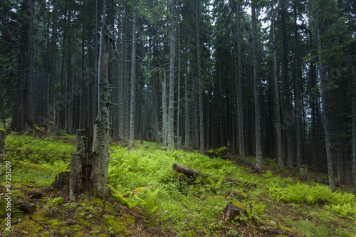 Obraz premium Misty and foggy day into the green forest