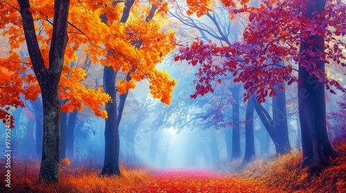 Fototapeta premium Misty Autumn Forest Path with Colorful Foliage