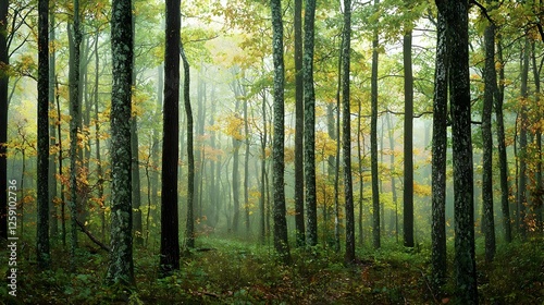 © artzone, Naklejka premium Misty Autumn Forest Scene with Golden Sunlight