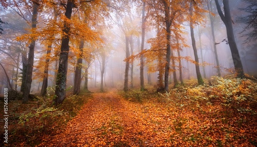 © Benjamin, Fototapeta premium misty autumn forest with orange leaves