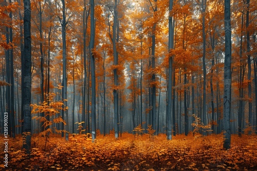Fototapeta premium Misty autumn forest with tall trees and vibrant orange foliage, creating a...