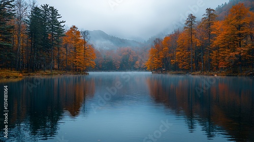 © pete99, Fototapeta premium Misty Autumn Lake Reflections in Mountains