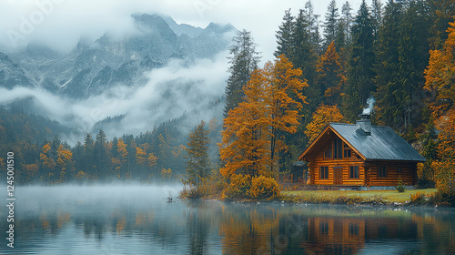 © Herdi, Fototapeta premium Misty autumn lake with wooden cabin nestled in colorful forest, mountains in background.