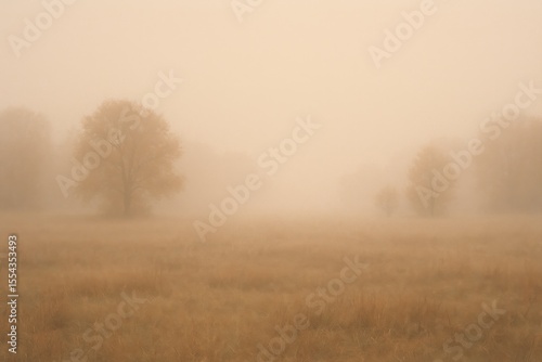 Fototapeta premium Misty Autumn Landscape with Foggy Grassy Field – Serene and Ethereal Nature...