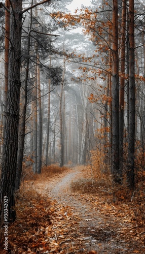 Fototapeta premium Misty autumn morning in the forest with winding path amidst towering trees...