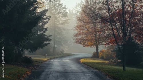 © Kitta Studio, Fototapeta premium Misty Autumn Morning on Serene Curved Road Surrounded by Trees