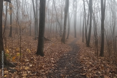 Obraz premium Misty autumn path through leaf-covered woods. Ideal for themes of mystery, peace, or fall.