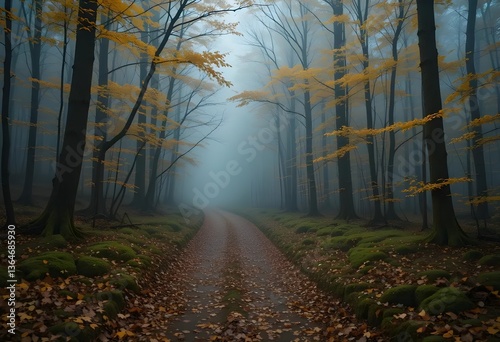 Naklejka premium "Misty Autumn Pathway Through the Woods"