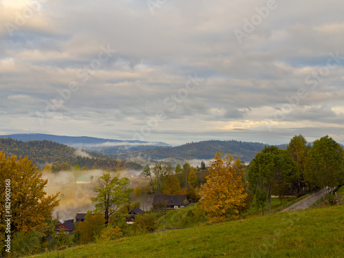 © thaarey1986, Obraz premium Misty Autumn Rain Clouds over Ukrainian Carpathian Mountains.
