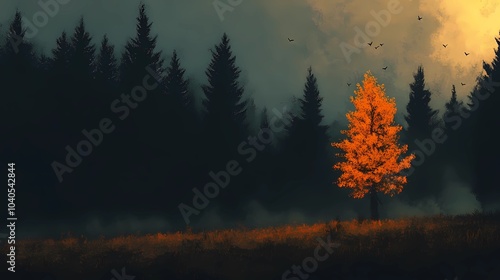 Fototapeta premium Misty autumn woodland, with colorful foliage and dense fog obscuring the background, perfect for tranquil and reflective nature-themed visuals.