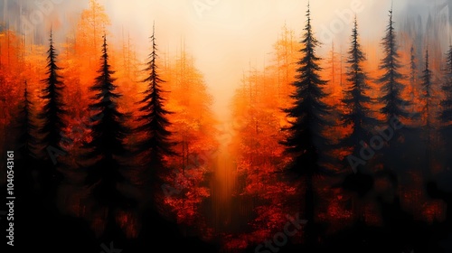 Fototapeta premium Misty autumn woodland, with colorful foliage and dense fog obscuring the...