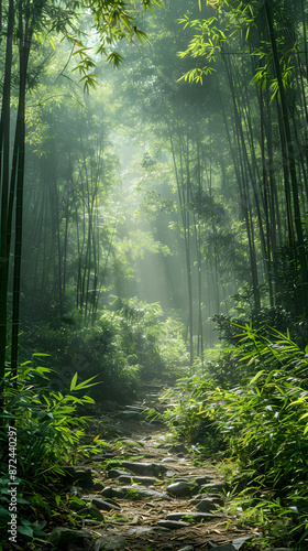 © NatthaphonSiri, Obraz premium Misty Bamboo Forest Path.
