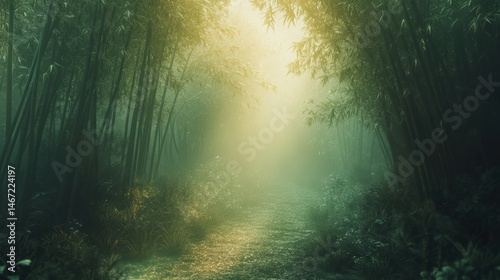 © SepazWorks, Fototapeta premium Misty Bamboo Forest Path with Golden Sunlight