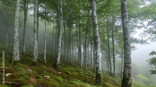 Obraz premium Misty birch forest with lush green moss