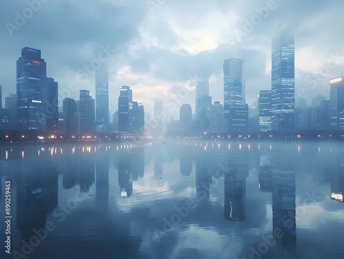 Obraz premium Misty City Skyline at Dawn Skyscrapers Reflected on Tranquil River