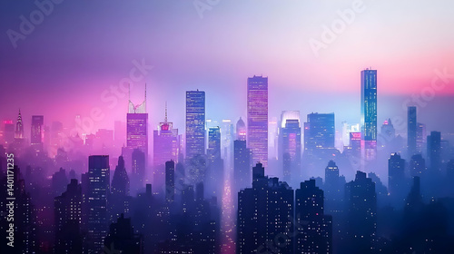 © Parsudi, Fototapeta premium Misty City Skyline At Twilight With Vibrant Neon Lights