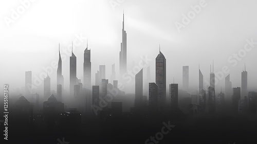 © Raffaza, Naklejka premium Misty City Skyline, Modern Architecture, Urban Landscape, Sunrise View, Stock Photo