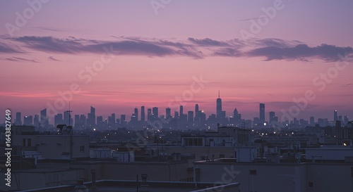 © Fauzi, Fototapeta premium Misty Cityscape at Dusk: Pink Sky Over Urban Rooftops