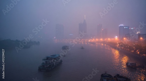 Naklejka premium Misty Cityscape: Boats on a Foggy River at Dusk