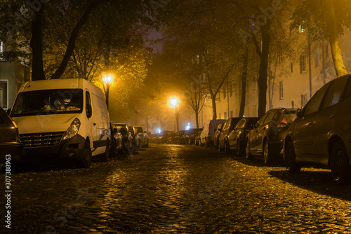 © Ronny Rose, Obraz premium Misty cobble stone road at night, foggy road at night, Wet and foggy road, cobble stone road,