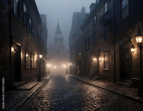 Fototapeta premium Misty Cobblestone Street at Night