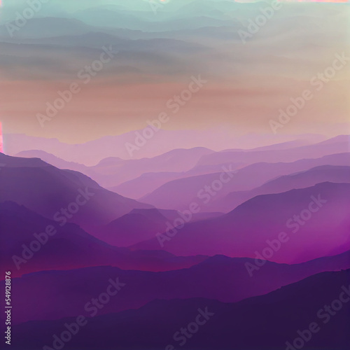 © Domingo, Fototapeta premium misty colorful landscape at sunset in the mountains with purple, pink and violet colors with turquoise in the sky - illustration in watercolor style for the artistic background of wallpaper or banner