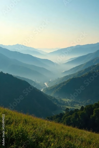 Fototapeta premium Misty dawn breaks over rolling hills and mountains under a clear sky, serene...