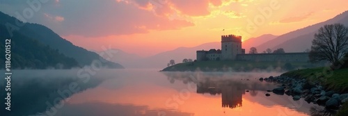 Fototapeta premium Misty dawn breaks over the fort's battlements with a serene lake in the foreground, dawn, reflection, peaceful