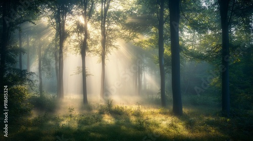 © Kopgz-41, Obraz premium Misty Dawn Forest: Stunning Nature Landscape Photography